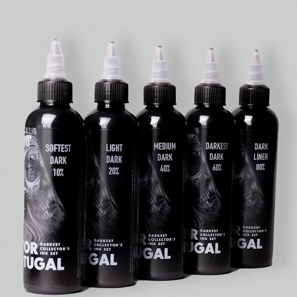 ست رنگ Radiant Victor Portugal Darkest Collector Ink شامل ۵ رنگ مختلف است که به تاتوآرتیستها این امکان را میدهد تا طراحیهای متنوع و عمیقی را با استفاده از رنگهای تیره و تأثیرگذار به اجرا درآورند.