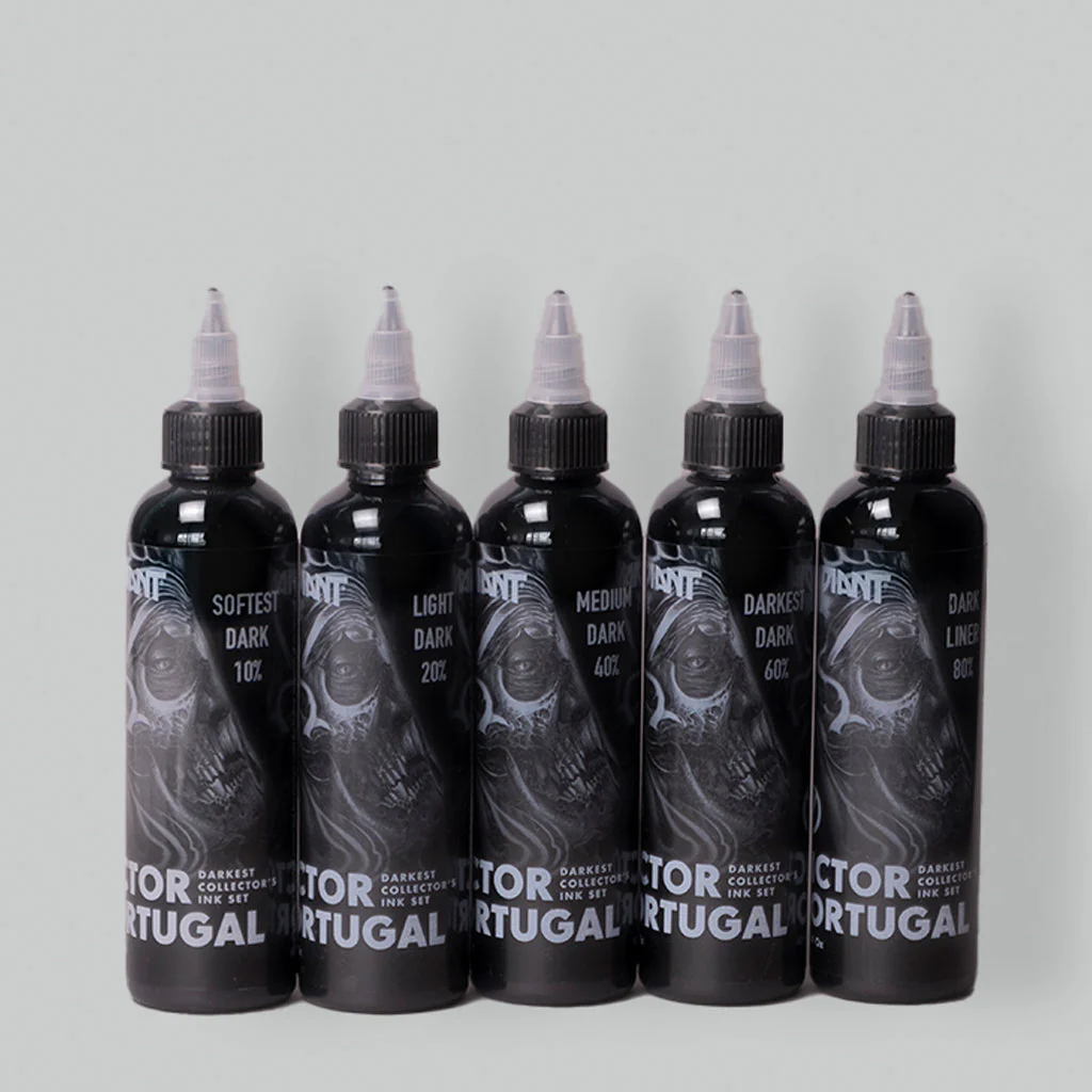 ست رنگ Radiant Victor Portugal Darkest Collector Ink، شامل ۵ رنگ مختلف است که به تاتوآرتیستها این امکان را میدهد تا طراحیهای متنوع و عمیقی را با استفاده از رنگهای تیره و تأثیرگذار به اجرا درآورند.